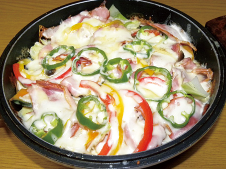 <Step.2>に食べやすい大きさに切ったキノコ類・ベーコン・パプリカを加え、火が通る少し前にとろけるチーズをかけ、チーズが溶けたら出来上がり♪